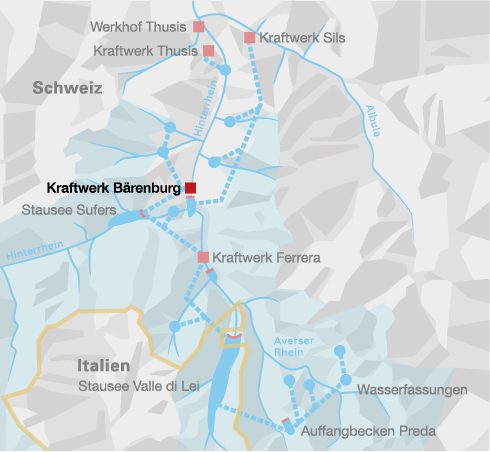 La Centrale di Bärenburg utilizza l'acqua raccolta nel serbatoio di Sufers e la restituisce nel bacino di compensazione di Bärenburg. Le quattro turbine Francis ad asse verticale sono dimensionate per un dislivello massimo di 321 m e un quantitativo di acqua utilizzabile di 80 mc/s. Il bacino assolve soprattutto una funzione di compensazione fra il salto medio Sufers-Bärenburg e il terzo e ultimo salto Bärenburg-Sils.