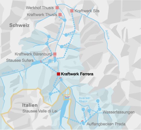 Nella centrale in caverna di Ferrera viene turbinata l'acqua del salto superiore accumulata nel serbatoio della Valle di Lei, prima di essere convogliata nel serbatoio di Sufers tramite la galleria di adduzione Ferrera-Sufers. La caverna è lunga 143 m, larga 29 m e alta 24 m – se misurata in linea di colmo. Fanno parte della caverna una galleria di accesso lunga 180 m, il pozzo piezometrico sul canale di scarico, una galleria per cavi e numerose altre gallerie per l'alimentazione e lo scarico dell'acqua nonché per l'aerazione. Con un dislivello massimo di 524 m possono essere utilizzati 45 mc/s di acqua in tre turbine Francis ad altissima pressione. L'installazione di turbine Francis in occasione della costruzione della centrale è stata una vera e propria opera pionieristica: normalmente per dislivelli così grandi si utilizzano ancora oggi turbine Pelton.
