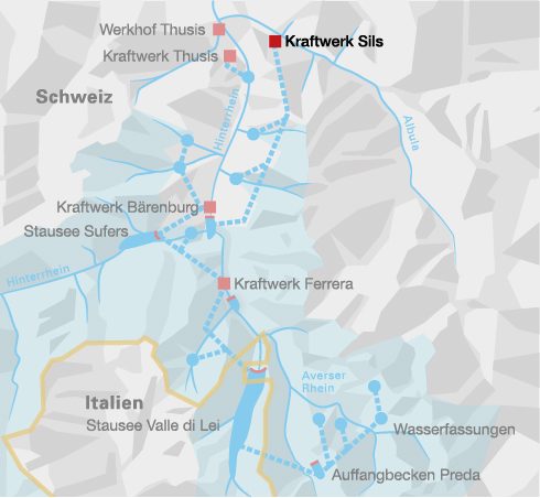La Centrale elettrica di Sils è stata costruita in modo convenzionale ai piedi del pendio: a pianoterra si accede alla sala macchine, dove si trovano i generatori ad asse verticale, mentre le relative turbine Francis sono disposte nel sottosuolo. L'acqua utilizzabile scorre dalle condotte di distribuzione nelle turbine attraverso gli organi di intercettazione (valvole sferiche) e poi mediante il canale di restituzione giunge nel fiume Albula. Le quattro turbine Francis del salto Bärenburg-Sils possono utilizzare 70 mc/s di acqua. Il dislivello massimo è di 413 m.