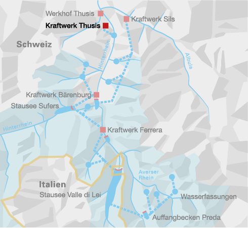 Dopo due anni di lavori di costruzione, nel 1968 è stata messa in servizio una nuova centrale a Thusis che, completamente rinnovata, serve oggi per l'approvvigionamento energetico dei comuni. La centrale sfrutta l'acqua di dotazione e i deflussi residuali del Reno posteriore nonché il salto di 100 metri che parte dalla presa d'acqua Rongellen con due turbine Francis ad asse orizzontale.